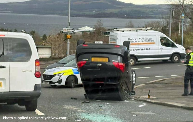 A CAR overturned and landed on its roof in Greenock today.